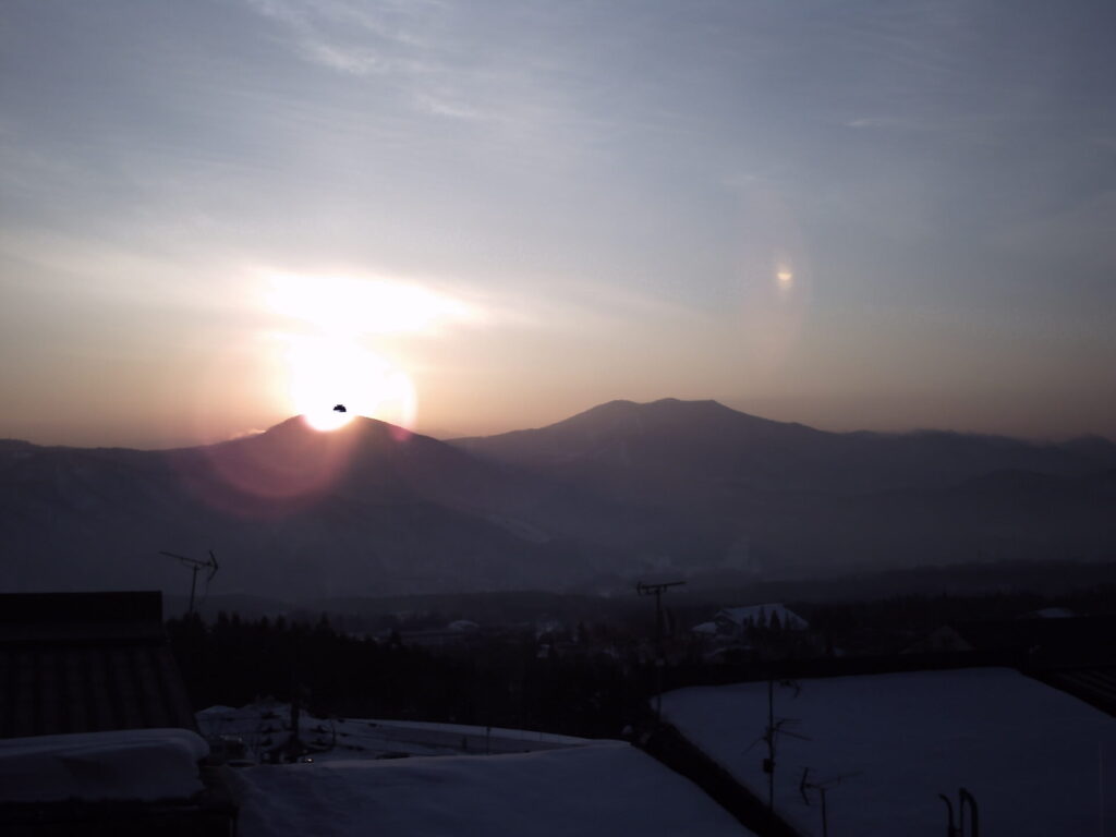 雪化粧に昇る朝日は神々しい